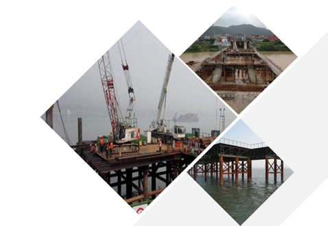 • 常見的施工平臺(tái)主要形式有:單棧橋平臺(tái)、雙棧橋平臺(tái)、利用鋼護(hù)筒導(dǎo)向和承載的平臺(tái)、利用圍堰或筑島承載的平臺(tái)、移動(dòng)式平臺(tái)、水中整體吊裝平臺(tái)